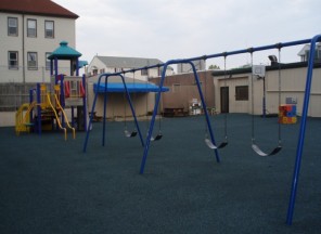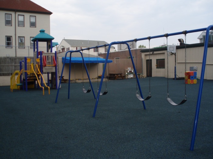The yard is covered with a poured-in rubber coating, providing a safer surface for play. There is an open space that allows for organized games and sports, as well as swings, a large climbing toy and a shaded sandbox. Children also enjoy sitting at one of the picnic tables to read a book or to engage in arts and crafts while outdoors.