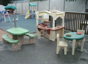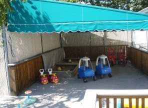 Our youngest toddlers can play safely away from older tots on this deck. Toddlers can be seen pushing and pulling toys, rocking, playing with balls or catching bubbles. This space is also used for infants where you might see them playing on a blanket away from our walking toddlers.