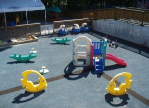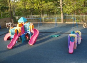 Children can run and jump on the rubber-surfaced playground. There are climbing toys, swings, a sandbox and a large area for riding bikes. There are also areas where children can build with blocks, engage in arts and crafts or simply sit at one of the picnic tables and read a book.
